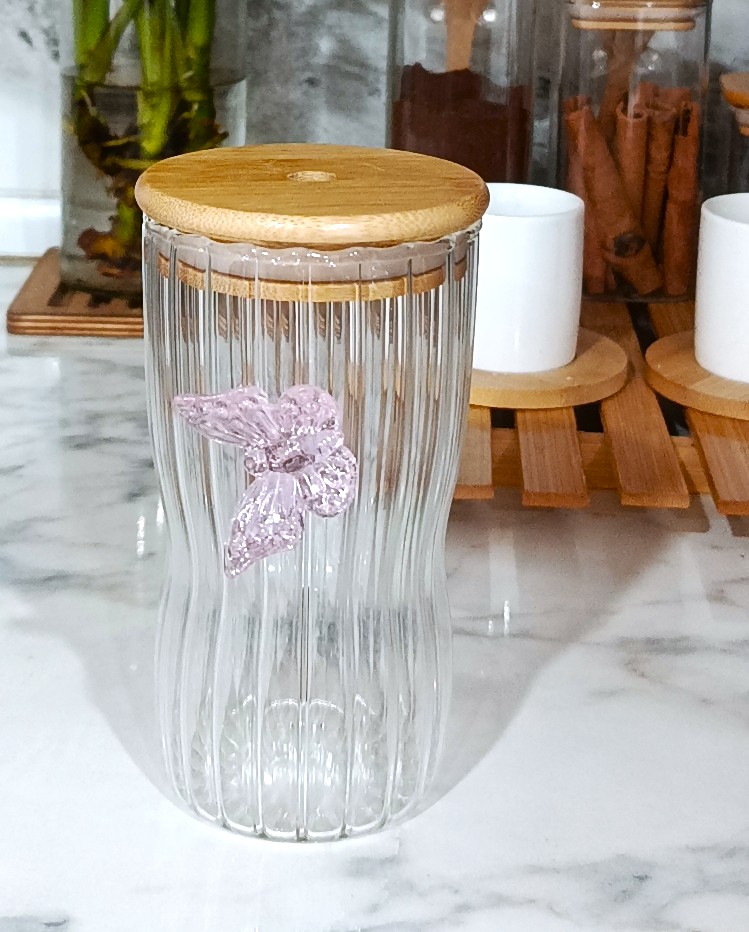 لیوان اسموتی شیاردار پروانه ای صورتی برجسته